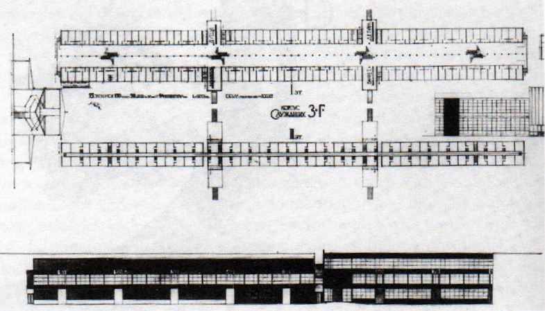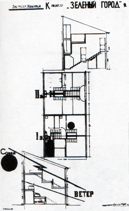 La Ciudad Verde, sin embargo, era otra cosa. Se trataba de una ciudad satélite cerca de Moscú para 100.000 habitantes (o usuarios) que no se vinculaba directamente a los centros de trabajo. De hecho, todo lo contrario: su razón de ser era el descanso intensivo de los trabajadores y por tanto, interesaba su más extremo alejamiento de la industria. Se preveía un tipo de alojamiento temporal, una especie de segunda residencia intercambiable, unida por los centros de cultura y educación y grandes masas verdes.